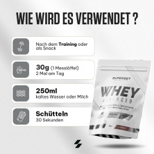 Nimm eine Portion von 30 g (ein Messlöffel) in 250 ml kaltem Wasser ein. Mit einem Shaker schütteln und trinken.