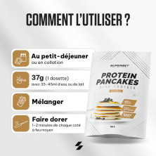 Dans 35 à 45 ml d'eau ou de lait, ajoute une dosette de 37 g puis mélange jusqu'à obtenir une pâte homogène. Fait chauffer une poêle antiadhésive et verses-y une louche de la pâte. Une fois que tu vois des bulles se former, retourne le pancake et laisse cuire 1 minute.
