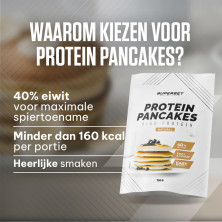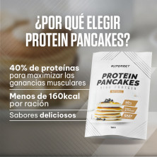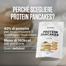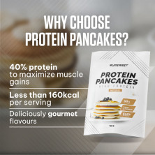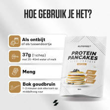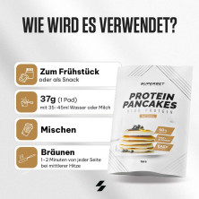 PROTEIN PANCAKES : mélanger 1 dosette (37 g) dans 35 à 45 ml d’eau ou de lait écrémé. Agiter vigoureusement jusqu'à obtenir une pâte homogène et onctueuse. Faire chauffer une poêle antiadhésive et y verser le mélange. Quand de petites bulles se forment sur le dessus (2 à 3 min), retourner le pancake et laisser cuire encore 1 minute. Déguster encore chaud, nature ou avec le topping de son choix.